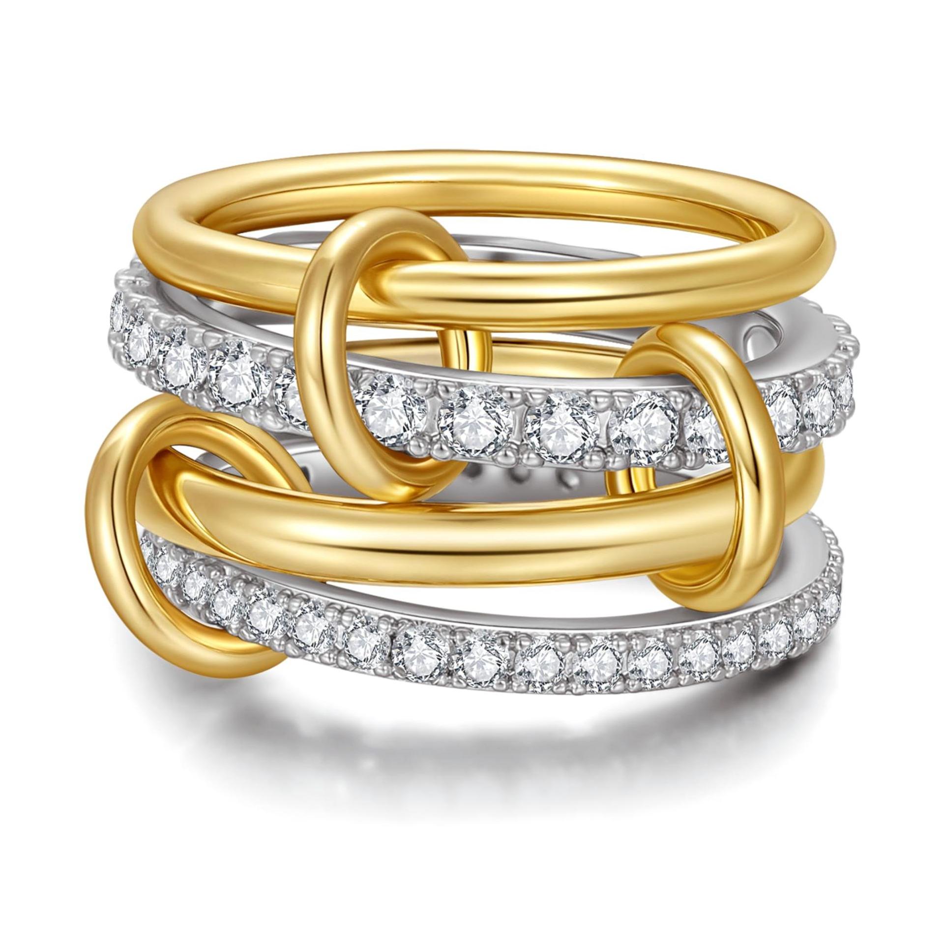 Stacked rings for women—mixing and matching metal jewelry is a very popular style right now. These rings are ubiquitous, suitable for various occasions, and will elevate your style! This ring set includes two plain gold rings and two silver rings set with cubic zirconia, all connected by a delicate gold link.