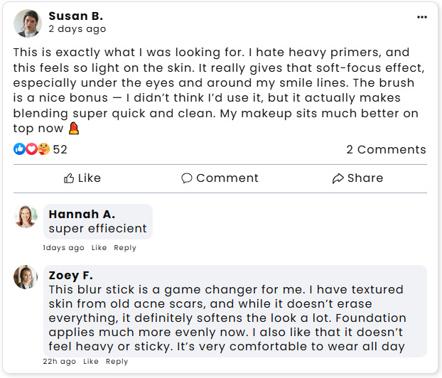 “I have the hardest time finding my shade, but this is magic! It blended into my skin tone perfectly. No more tide lines or guessing games. It’s my new holy grail.”